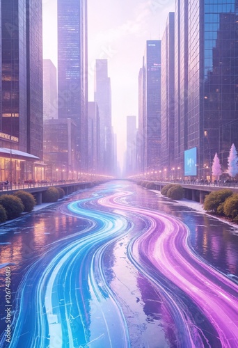Fototapeta premium Futuristic Cityscape at Night with Stream of Colorful Lights