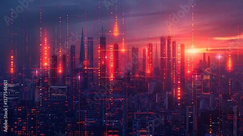 © theerachai, Naklejka premium Futuristic Cityscape at Sunset Digital Data Streams Over Modern Buildings