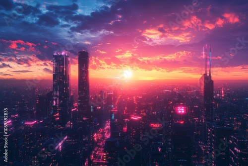 Fototapeta premium Futuristic cityscape at sunset neon lights illuminate a cyberpunk skyline against dramatic clouds