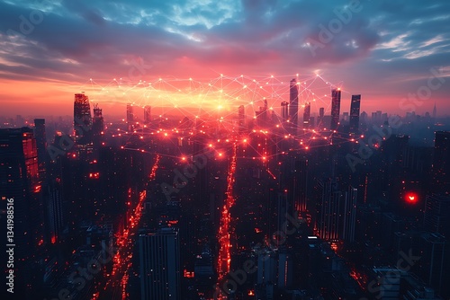 © MdAli, Fototapeta premium Futuristic Cityscape at Sunset Network Connections and Urban Skyline Illustration
