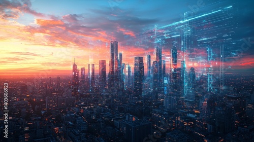 © Jakkarin, Fototapeta premium Futuristic Cityscape at Sunset with Digital Elements and Details