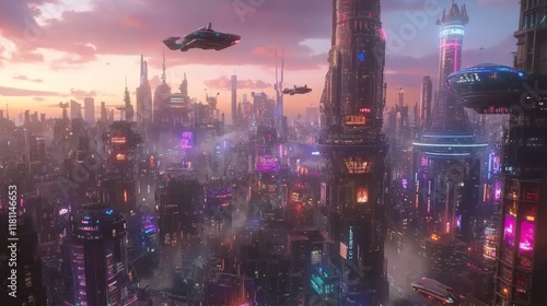 Fototapeta premium Futuristic cityscape at sunset with flying vehicles.