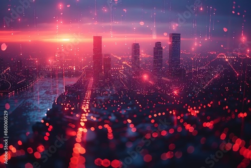 Fototapeta premium Futuristic cityscape at sunset with glowing network connections, showcasing...