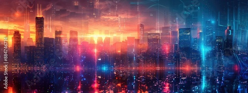 Obraz premium Futuristic Cityscape at Sunset with Holographic Technology and Neon Lights