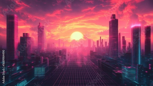 Fototapeta premium Futuristic cityscape at sunset with neon-lit skyscrapers and a glowing sun beneath vibrant pink and orange clouds