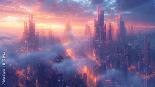© studio clever, Fototapeta premium Futuristic Cityscape at Sunset with Skyscrapers and Clouds - Generative AI