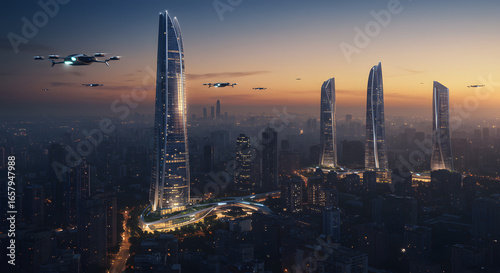 © xxvi, Obraz premium Futuristic Cityscape at Twilight with Autonomous Drones and Illuminated Modern Skyscrapers