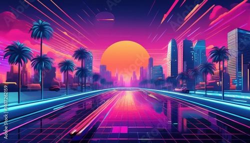 © netsay, Fototapeta premium Futuristic Cityscape Bathed in Neon Lights, Los Angeles Pixelated Dreamscape in Vaporwave Style at Dusk, Featuring a Blend of Retro and Modern Elements with an Electrifying Aura.