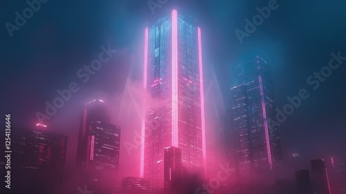 © Stockfish, Obraz premium Futuristic cityscape featuring illuminated skyscrapers in a misty atmosphere.
