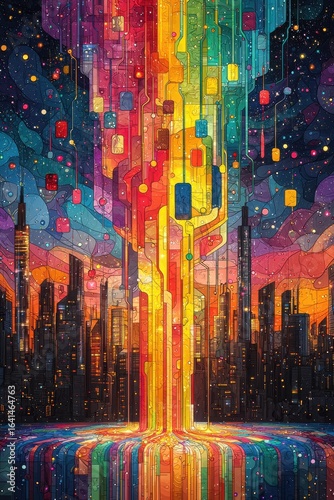 © Georgii, Obraz premium Futuristic cityscape framed by vibrant and colorful abstract patterns and shapes