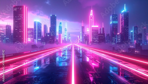 Fototapeta premium Futuristic cityscape glows with vibrant neon lights reflecting on wet streets...