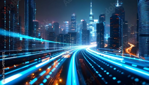 Fototapeta premium Futuristic cityscape highway at night with glowing light trails.