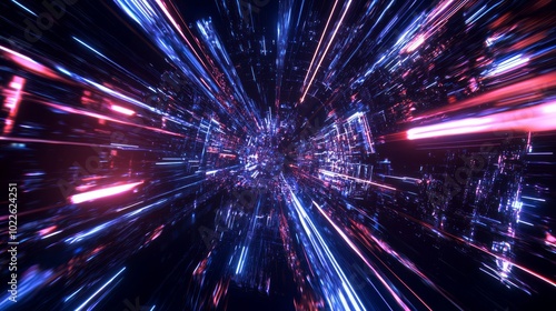 © Jakkarin, Fototapeta premium Futuristic Cityscape: Hyper Detailed 3D Rendering with Vibrant Light Trails and Digital Motifs