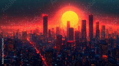 Fototapeta premium Futuristic cityscape illuminated by a glowing sunset and digital connections
