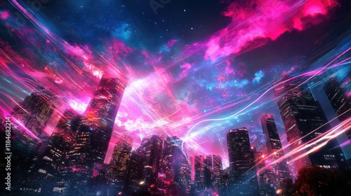 © Ilmi, Fototapeta premium Futuristic cityscape illuminated by neon lights, towering skyscrapers connected by glowing 5G networks and vibrant data streams in the night sky