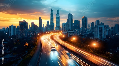 © Heng Heng - AI Stock, Fototapeta premium Futuristic cityscape illuminated by vibrant blue light trails symbolizing the seamless connectivity and high speed data transfer of 5G technology