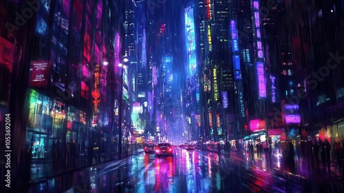 © Bijac, Fototapeta premium futuristic cityscape illuminated by vibrant neon lights at night, with tall skyscrapers and glowing windows. the street is dark and defocused, creating a dynamic urban atmosphere