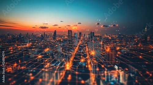 © Biancaart, Fototapeta premium Futuristic Cityscape Illuminated With Flying Vehicles Above