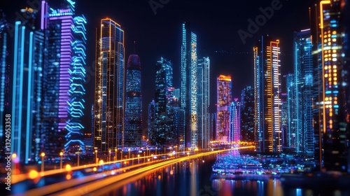 Fototapeta premium Futuristic cityscape illuminates the night sky with vibrant neon colors