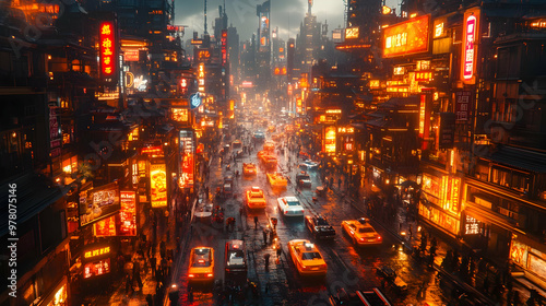 © farikhin, Fototapeta premium Futuristic Cityscape Illustration - Neon Lights and Rain