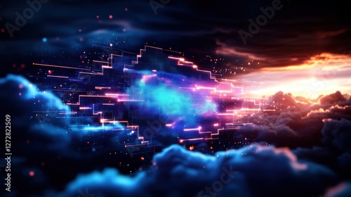 Fototapeta premium Futuristic cityscape in clouds with abstract blue mint and pink background in high fidelity digital art