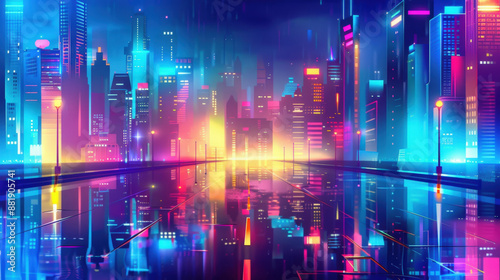 Obraz premium Futuristic cityscape is reflecting on wet asphalt on a night with colorful...