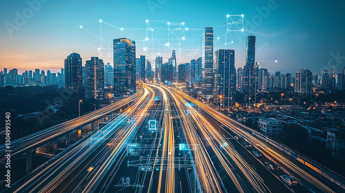 © Oleksandr, Fototapeta premium Futuristic Cityscape: Light trails streak through a modern city, symbolizing speed and connection, enhanced by digital network overlays.