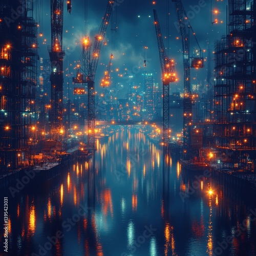 © Grameh, Fototapeta premium Futuristic Cityscape: Night Construction on the Water