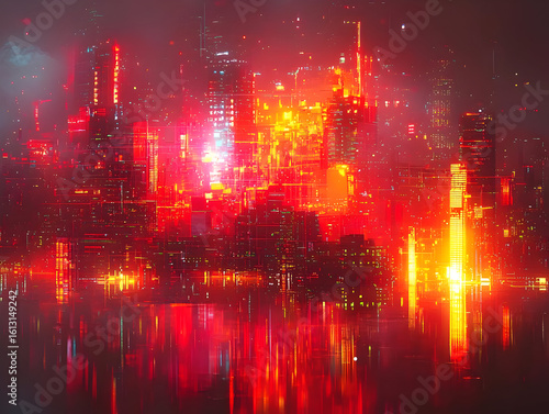 © Hokiia, Fototapeta premium Futuristic Cityscape: Red and Orange Neon Lights Reflect on Water at Night