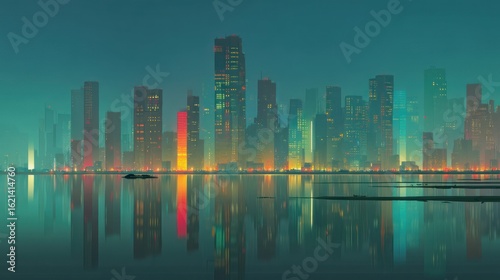 Fototapeta premium Futuristic cityscape reflecting on calm water at night