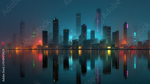 Fototapeta premium Futuristic Cityscape Reflecting on Calm Waters during Twilight hours