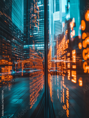 © ivlianna, Obraz premium Futuristic cityscape showcasing vibrant stock exchange tickers reflecting on glass facades