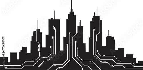 Fototapeta premium Futuristic Cityscape Silhouette with Circuit Board Details for Technology and Innovation