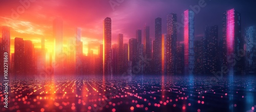 Naklejka premium Futuristic cityscape skyline at dusk with glowing lights and a vibrant sunset...