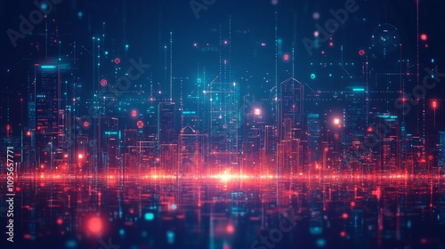 Obraz premium Futuristic cityscape skyline at night with digital data streams and glowing...