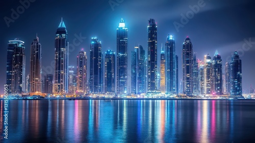 © Khaisan, Fototapeta premium Futuristic cityscape skyline view with towering skyscrapers and water reflection