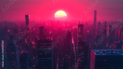 © Artajar, Fototapeta premium Futuristic Cityscape Sunset Dramatic Pink Skyline Urban Scenery