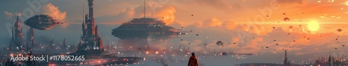 © Hamdee, Fototapeta premium Futuristic Cityscape Sunset Flying Vehicles Advanced Architecture Sci Fi Panorama