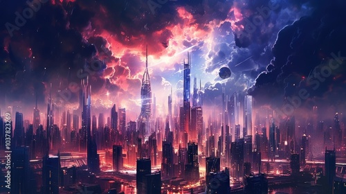 Fototapeta premium Futuristic Cityscape Under a Dramatic Sky