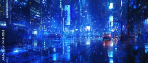 Obraz premium Futuristic cityscape under a torrential downpour with neon reflections