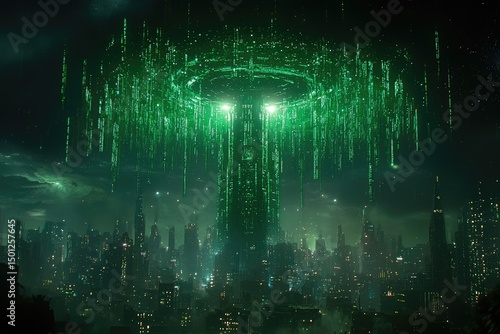 © alice, Obraz premium Futuristic cityscape under glowing green digital structure.