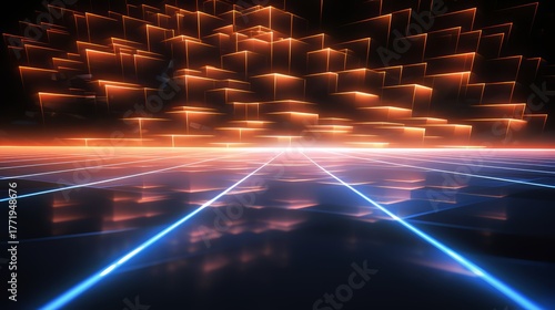Fototapeta premium Futuristic cityscape with a blue sky and orange and blue lights. The city is filled with tall buildings and bright lights, creating a vibrant and energetic atmosphere