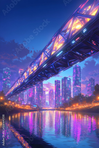 © Nadiyah, Obraz premium Futuristic cityscape with a glowing bridge over a river at dusk.