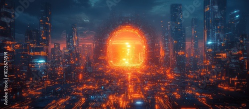 © GoDress, Obraz premium Futuristic cityscape with a glowing portal in the distance.