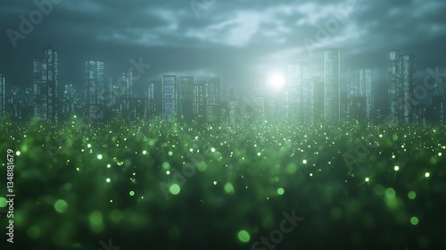 © AhmadTriwahyuutomo, Fototapeta premium Futuristic cityscape with a green, illuminated foreground under a cloudy sky.