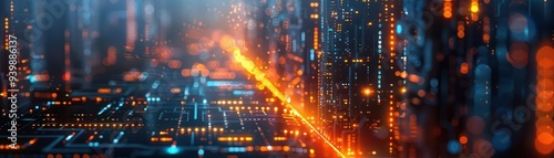 © Nawarit, Fototapeta premium Futuristic cityscape with advanced tech, Cyberpunk, Bright, Digital, Highlighting innovation