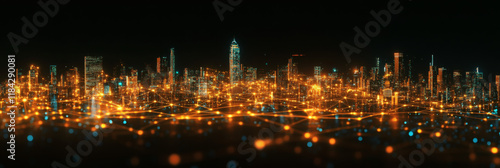 © Unic, Obraz premium futuristic cityscape with buildings connected by digital pathways. integration technology , network of digital lines connecting