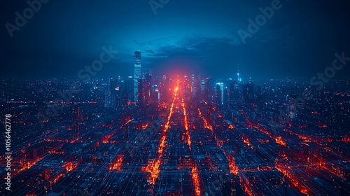 © CRISPIFLY, Naklejka premium Futuristic Cityscape with Connected Network Night View Digital City Urban Development Modern