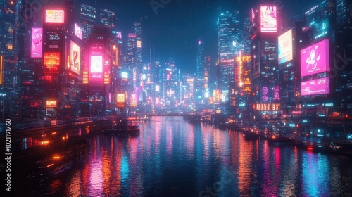 © Katavudh, Obraz premium Futuristic cityscape with digital advertisements for fintech apps, neon lights, skyscrapers, urban technology, high detail, cyberpunk style