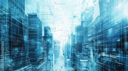 © sutinah, Obraz premium Futuristic cityscape with digital blueprints overlay